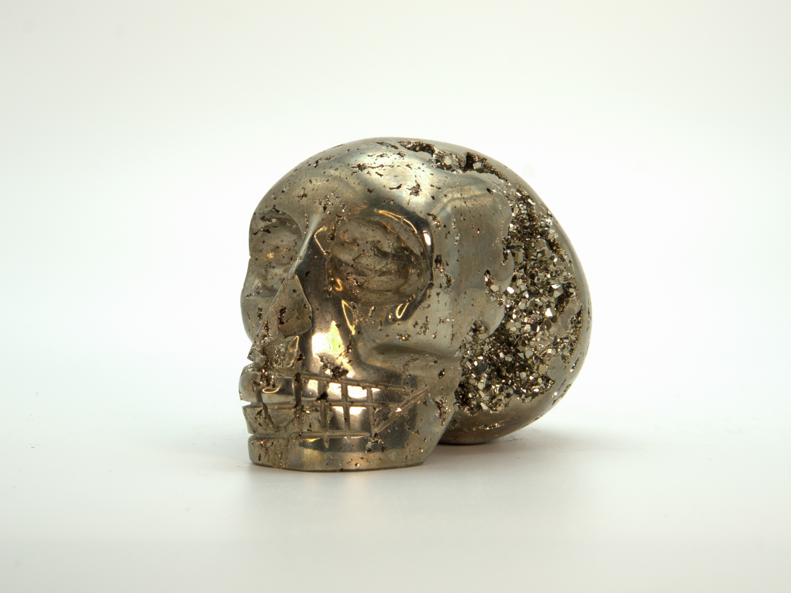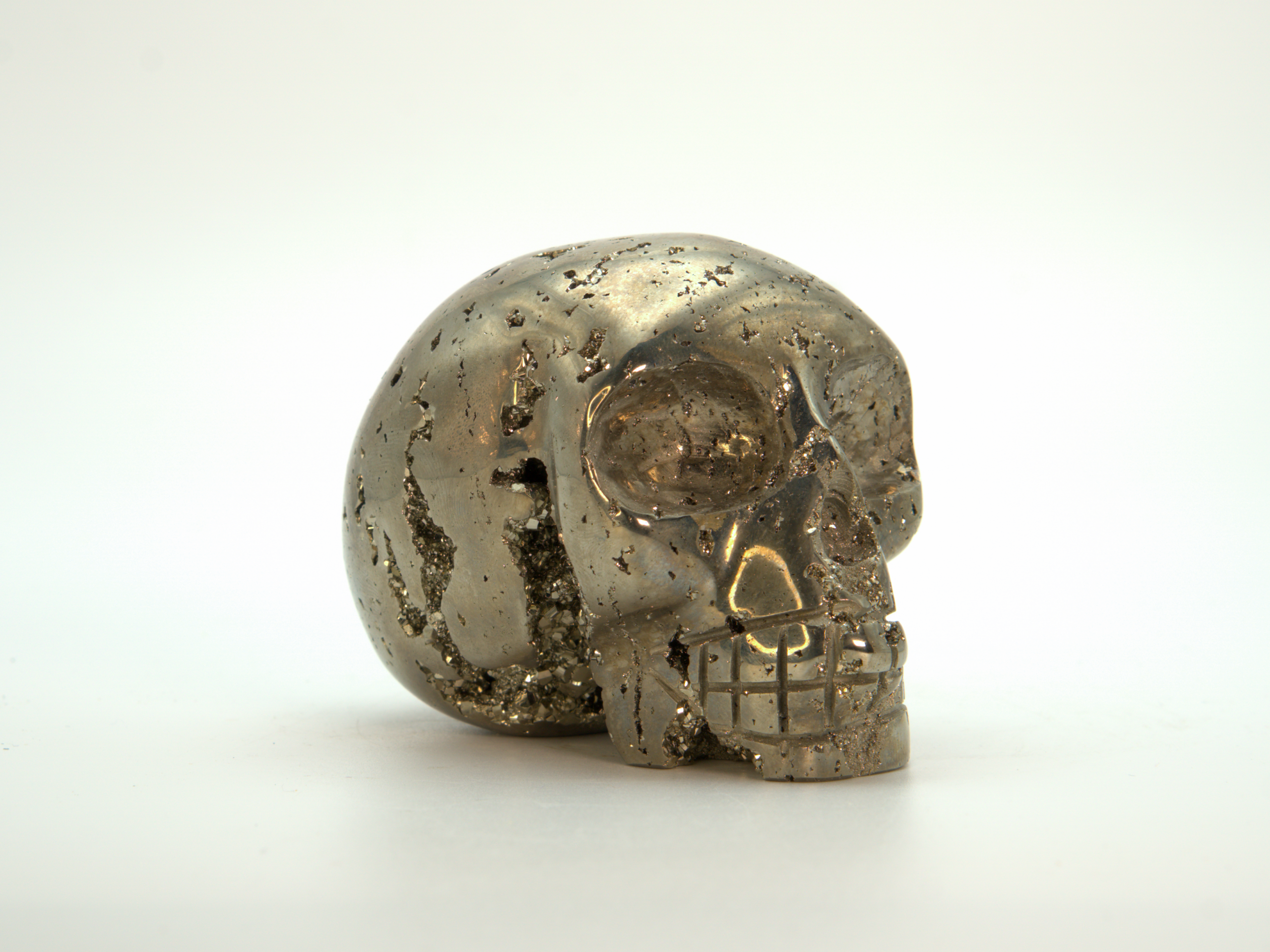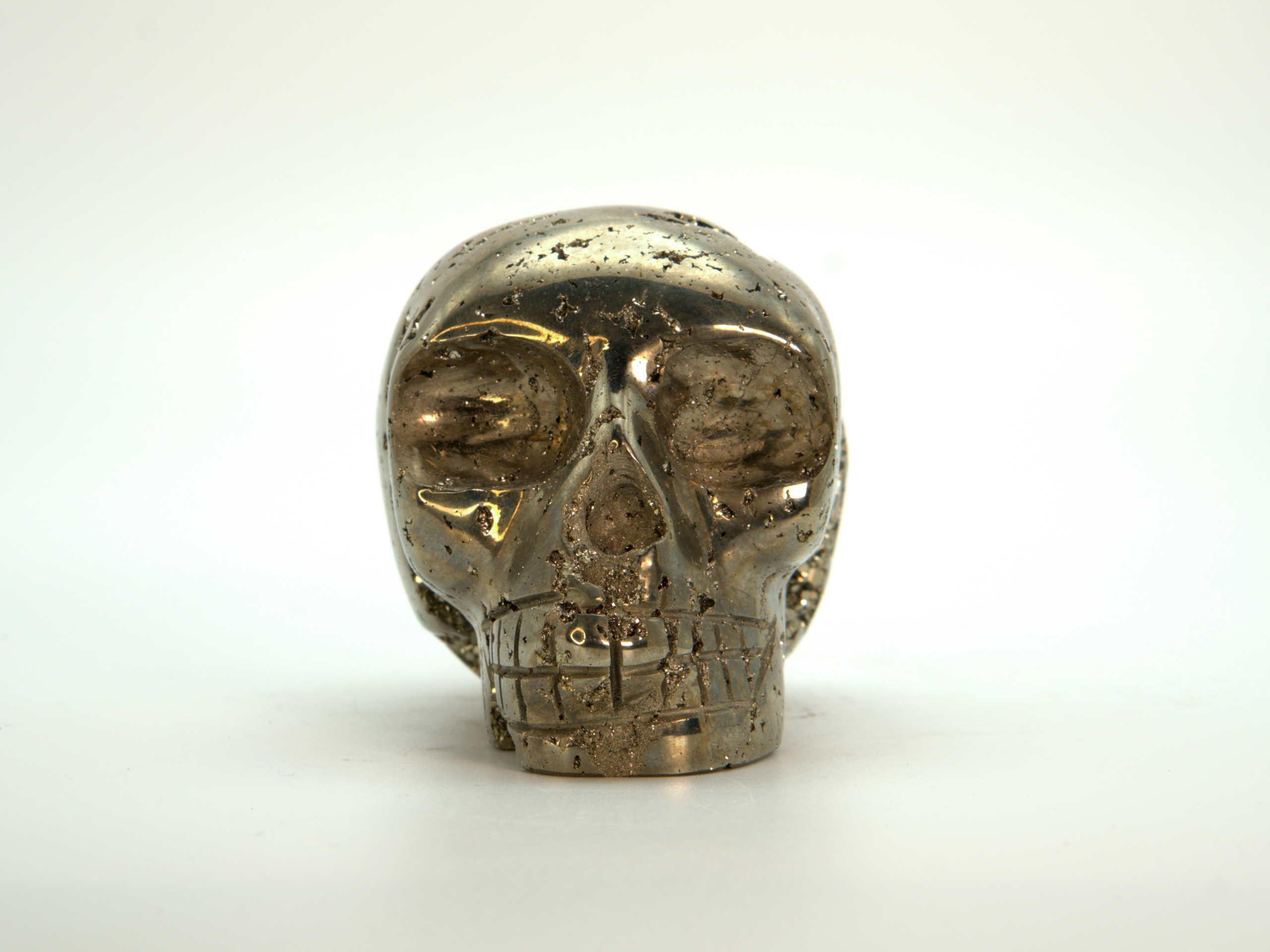 This unique pyrite skull weighs 1.2 pounds and is 2 and 1/2 inches tall with a length of 3 inches and a width of 2 inches.