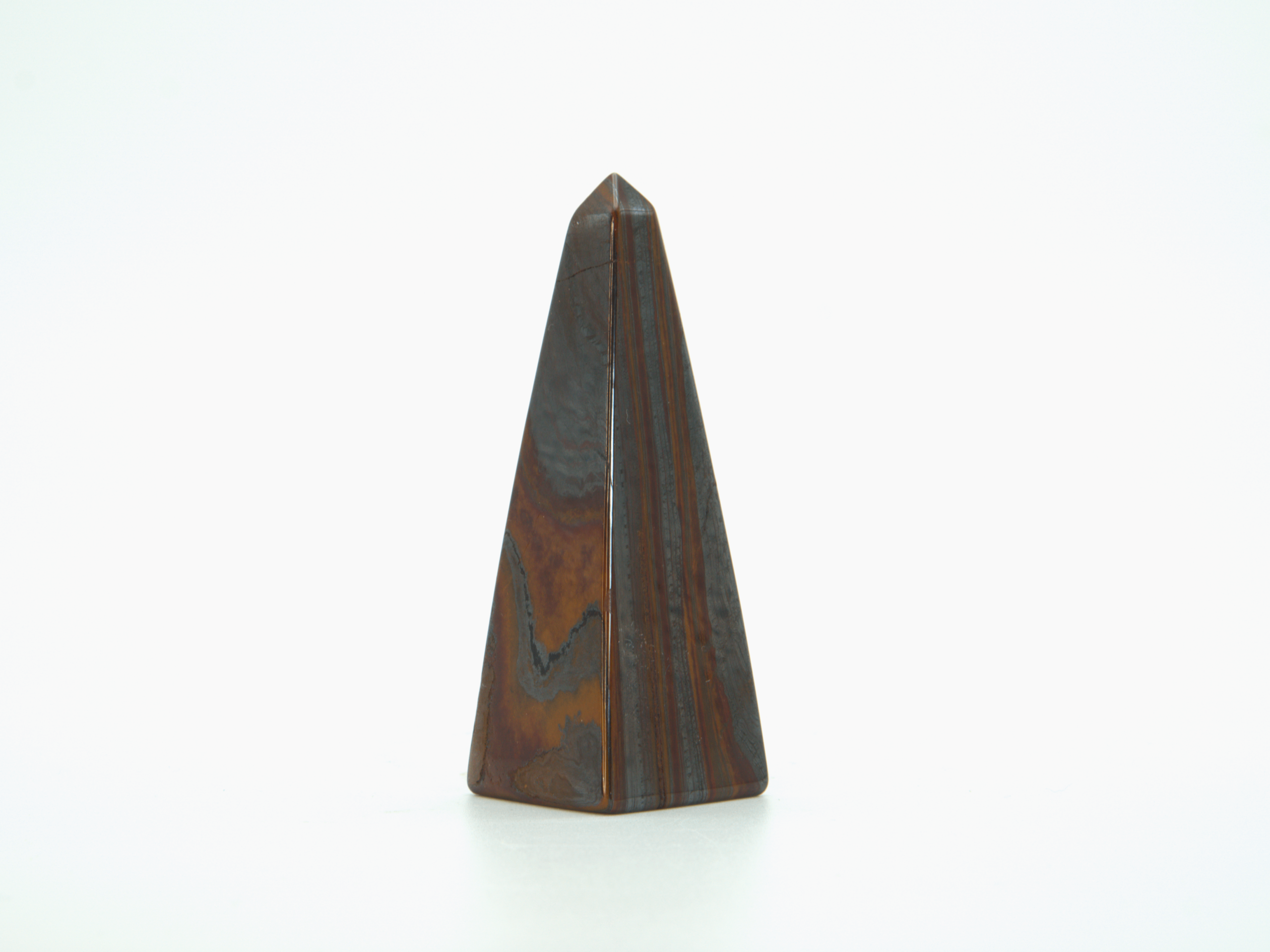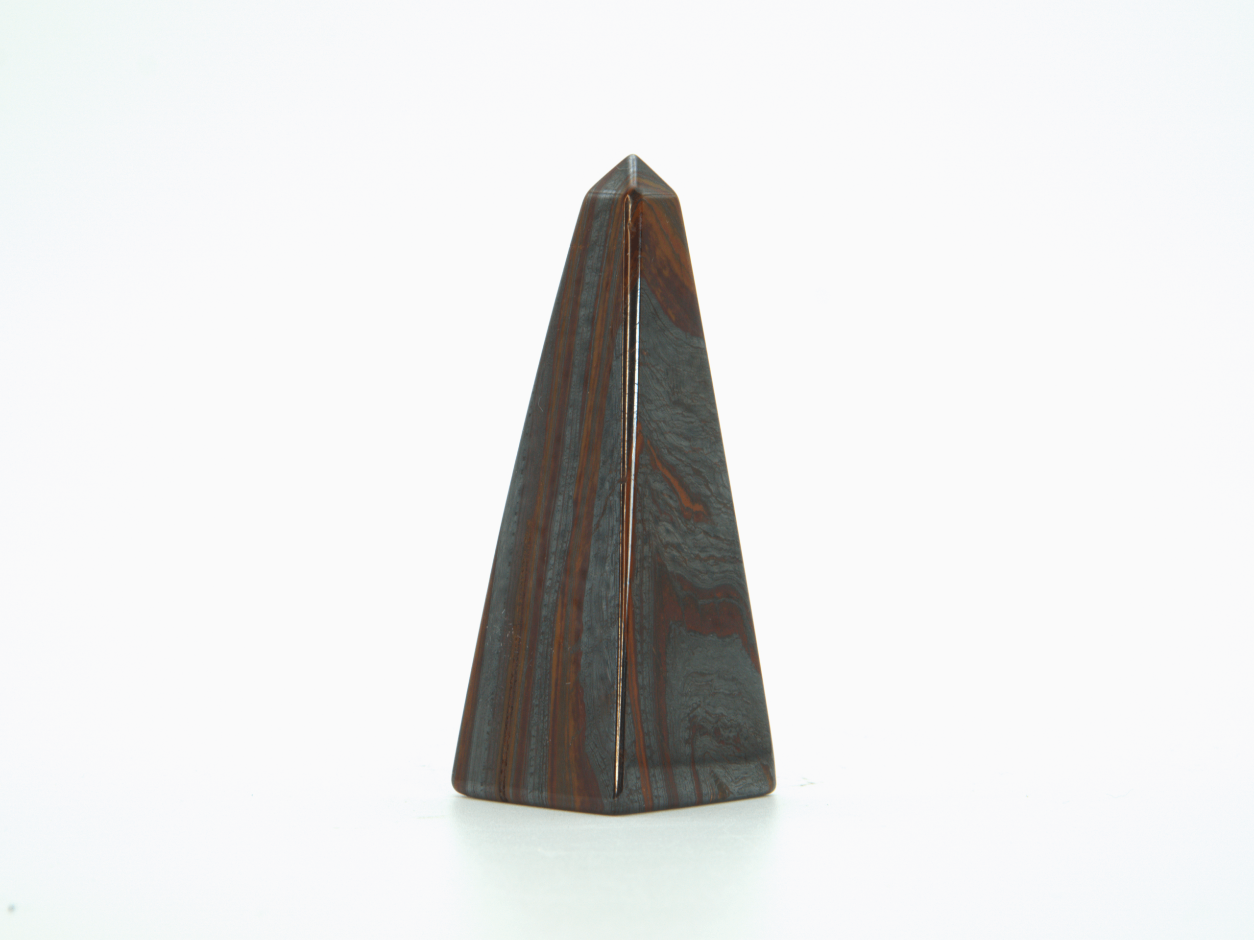 This Tiger Iron obelisk stands 3″ tall and is 1″ wide at its base. It weighs roughly .3 lbs.