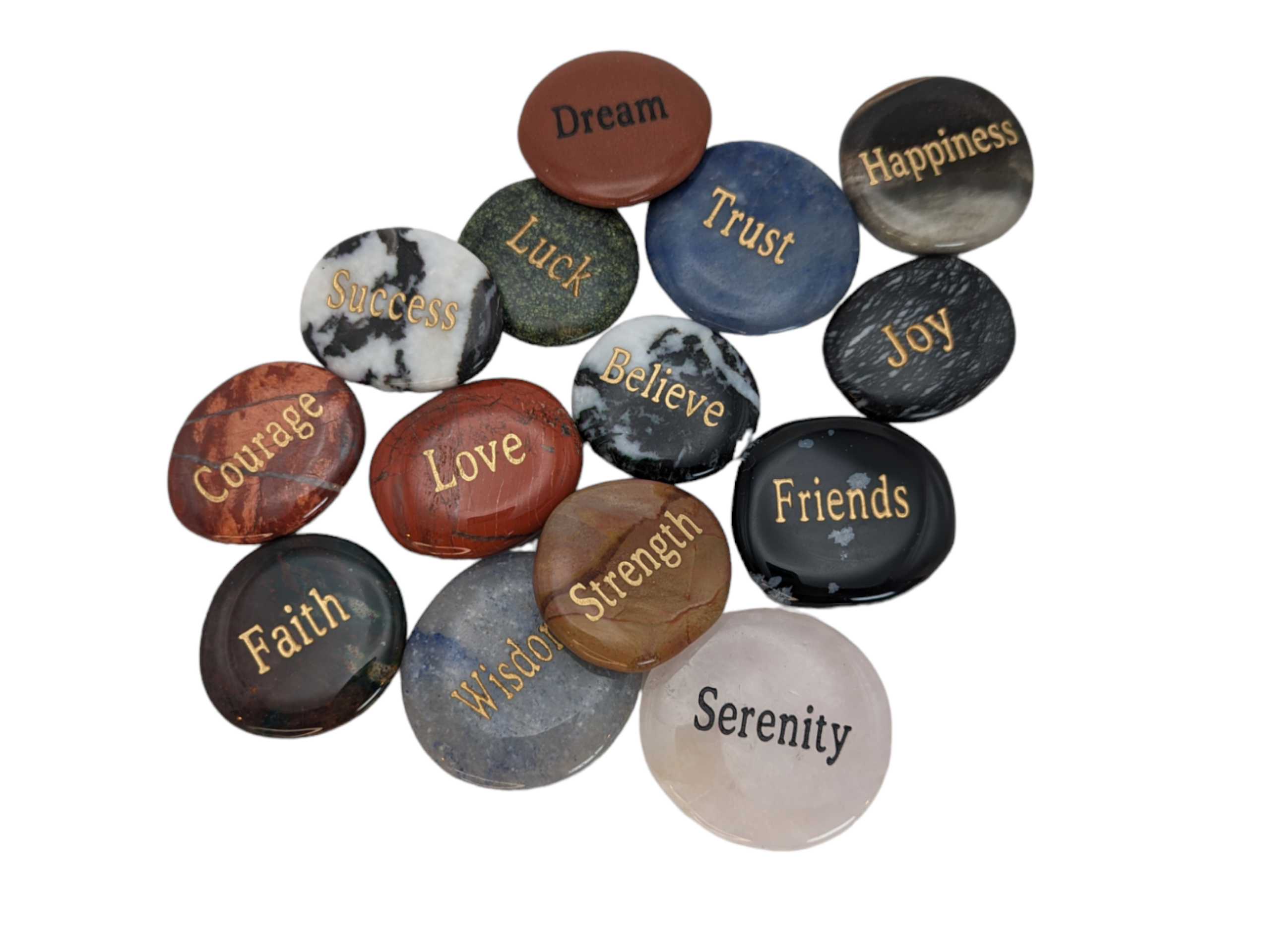 Words stones come in a mixed variety of stones each with its own word of affirmation. Each is about 1 1/2″ to 2″ in width and length. Tumbled, polished and engraved.